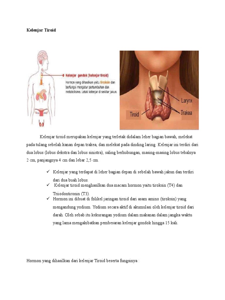 Kelenjar tiroid berfungsi untuk membuat hormon tiroid yaitu tiroksin tetraiodotironin atau T 4 dan triiodotironin T 3 yang penting untuk pertumbuhan diferensiasi sel pengaturan laju metabolisme basal dan konsumsi oksigen sel di seluruh tubuh. Penting untuk menjaga keseimbangan hormon tiroid dalam tubuh. Endokrin adalah sebuah kelenjar yang tersebar di tempat tertentu di tubuh untuk menghasilkan hormon.
