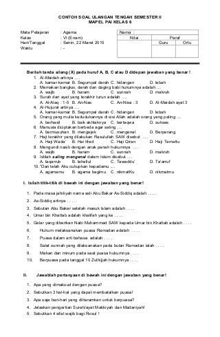Contoh Soal Ulangan Tengah Semester Ii Mapel Pai Kelas 6 Mata Pelajaran Agama Nama Kelas Vi Enam Nilai Paraf Hari Islam Semester Education